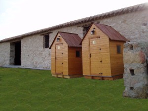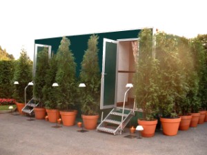 Aseos  | |  | |  | Módulos de aseos con diferentes opciones de capacidad para su evento | | Interiores de lujo con maderas nobles, hilo musical, calefacción, cabinas individuales, tocador, personal uniformado de servicio durante el evento, .... | | Cabinas wc individuales de madera con techo a dos aguas, iluminación interior, lavabo, dispensador de papel, jabón,... |