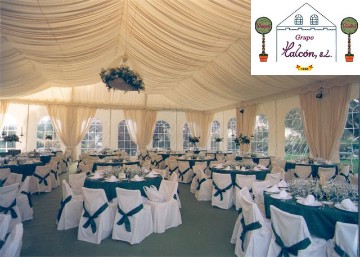 Iluminación general para el interior de la carpa  | |  | |  | |  | Focos halógenos lacados e indirectos | | Grandes lámparas centrales de hierro de tres cuerpos, decoradas con diversos tipos de plantas y elementos decorativos dependiendo del modelo elegido (Toscana, Tokio o Soho) | | Focos especiales de haz de luz, focos con filtros de color para crear los tonos de ambiente deseados (morado, fucsia, azul, etc...), focos especiales con gobos y trust para instalar este montaje y si lo precisase | | Proyectores especiales con gobos incorporados para proyectar diversas figuras a elegir en puntos especificos (una pared, suelo, etc...) |